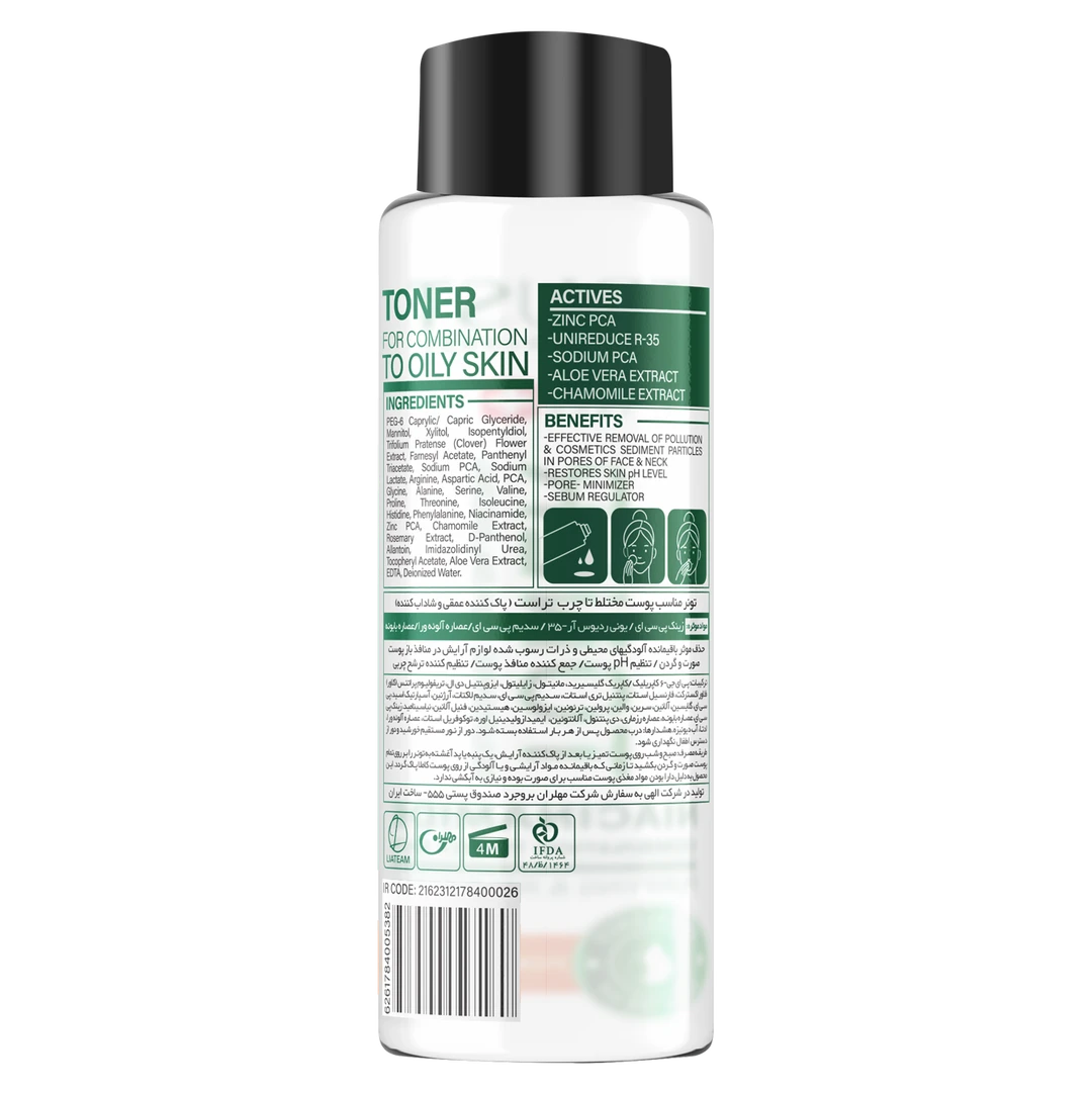 تونر مناسب پوست چرب و مختلط تراست، با داشتن زینک پی سی ای و یونی ردیوس آر-35 در ساختار خود، از ایجاد جوش و آکنه جلوگیری کرده و تولید سبوم در پوست را کنترل میکند. سدیم پی سی ای در این محصول، پوست را آبرسانی کرده و به جذب آب در لایههای سطحی پوست کمک میکند. این تونر به علت وجود عصاره آلوئهورا، از التهابات پوست جلوگیری کرده و چربی پوست را کنترل میکند. علاوه بر این، وجود عصاره بابونه در این محصول باعث ایجاد خواص آنتیاکسیدانی شده و از پوست در برابر آسیب رادیکالهای آزاد مراقبت میکند.