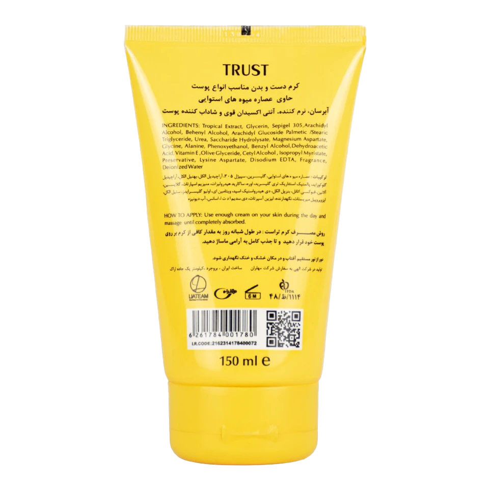 عصاره میوههای استوایی بکار رفته در کرم میوههای استوایی تراست سرشار از فلاونوئیدها، ویتامین C، آهن و آنتی اکسیدانهای بسیار قوی بوده که به رادیکالهای آزادی که به پوست آسیب میزنند، حمله کرده و در حین آبرسانی به پوست، آنها را نیز از بین میبرد. این کرم ظاهر و شرایط مناسبی را برای پوست فراهم میآورد و از تبخیر آب پوستی جلوگیری کرده، موجب افزایش رطوبت پوست و نهایتا نرم کنندگی آن پس از مصرف میشود.