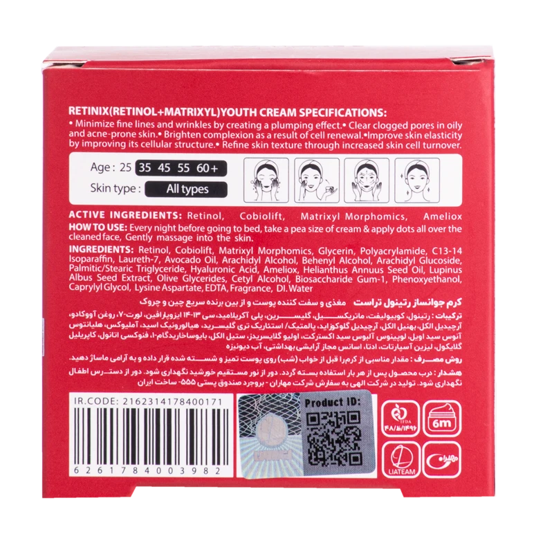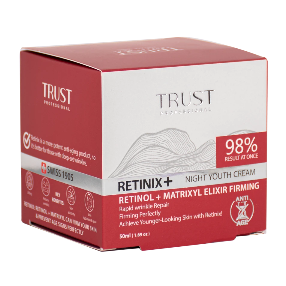 و در نهایت، آملیوکس موجود در کرم جوانساز رتینول تراست، با جلوگیری از تأثیر پرتوهای مضر UV و با خواص آنتیاکسیدانی ویژهای که دارد، چینوچروکهای پوستی را بهبود بخشیده و از شکستن و تغییر فرو پروتئین کلاژن و نیز پیری پوست جلوگیری میکند. در کنار مواد مؤثره مطرحشده، این محصول تراست، با عصاره دانه لوپینوس آلبوس، به حفظ استحکام و افزایش خاصیت کشسانی پوست، با لایزین آسپارتات، به بهبود سوختوساز سلولهای پوستی و تکثیر آنها، با روغن آووکادو، به حفظ استحکام و پایداری پوست و با هلیانتوس آنوس سید اویل، به بهبود آبرسانی و جلوگیری از پیری پوست، کمک میکند.