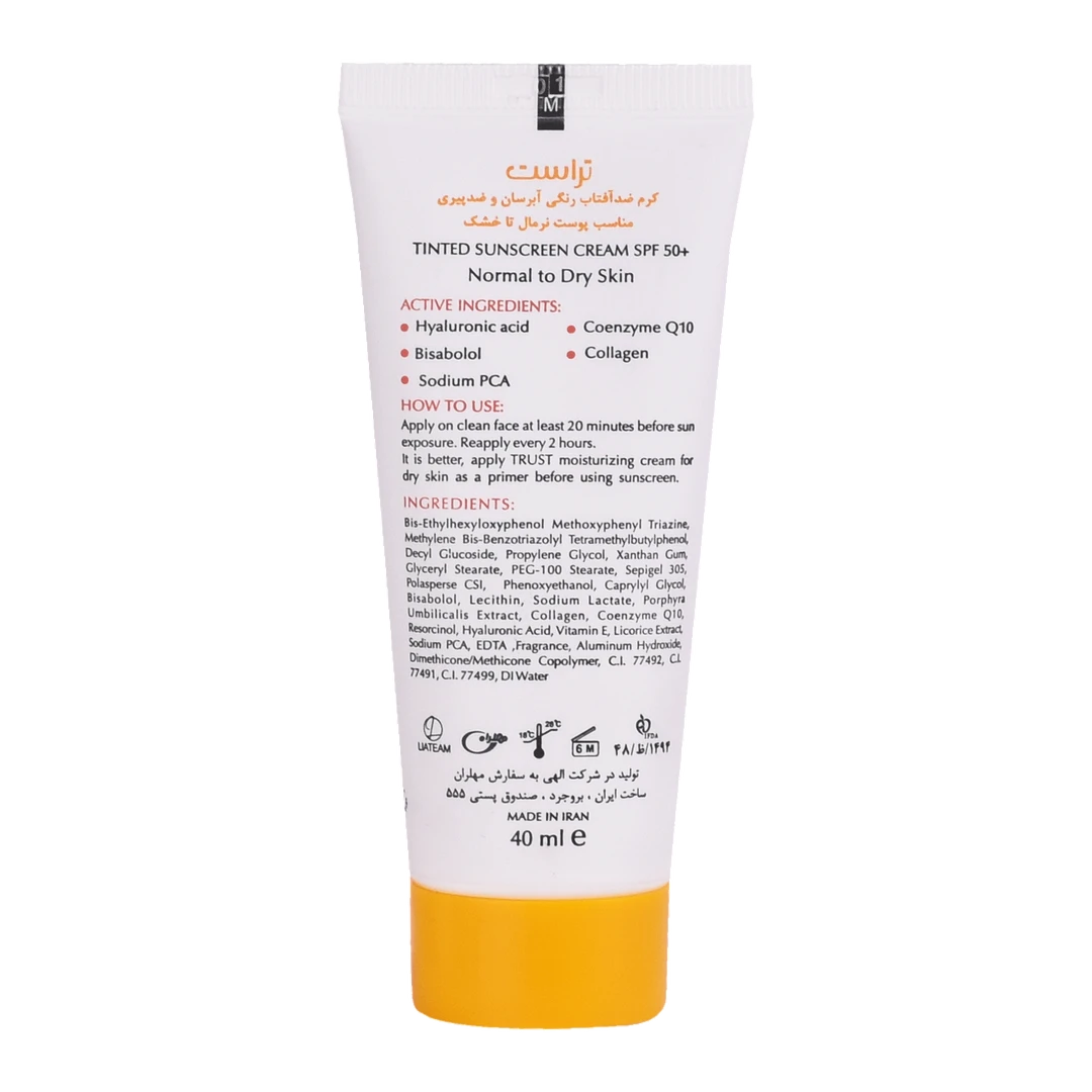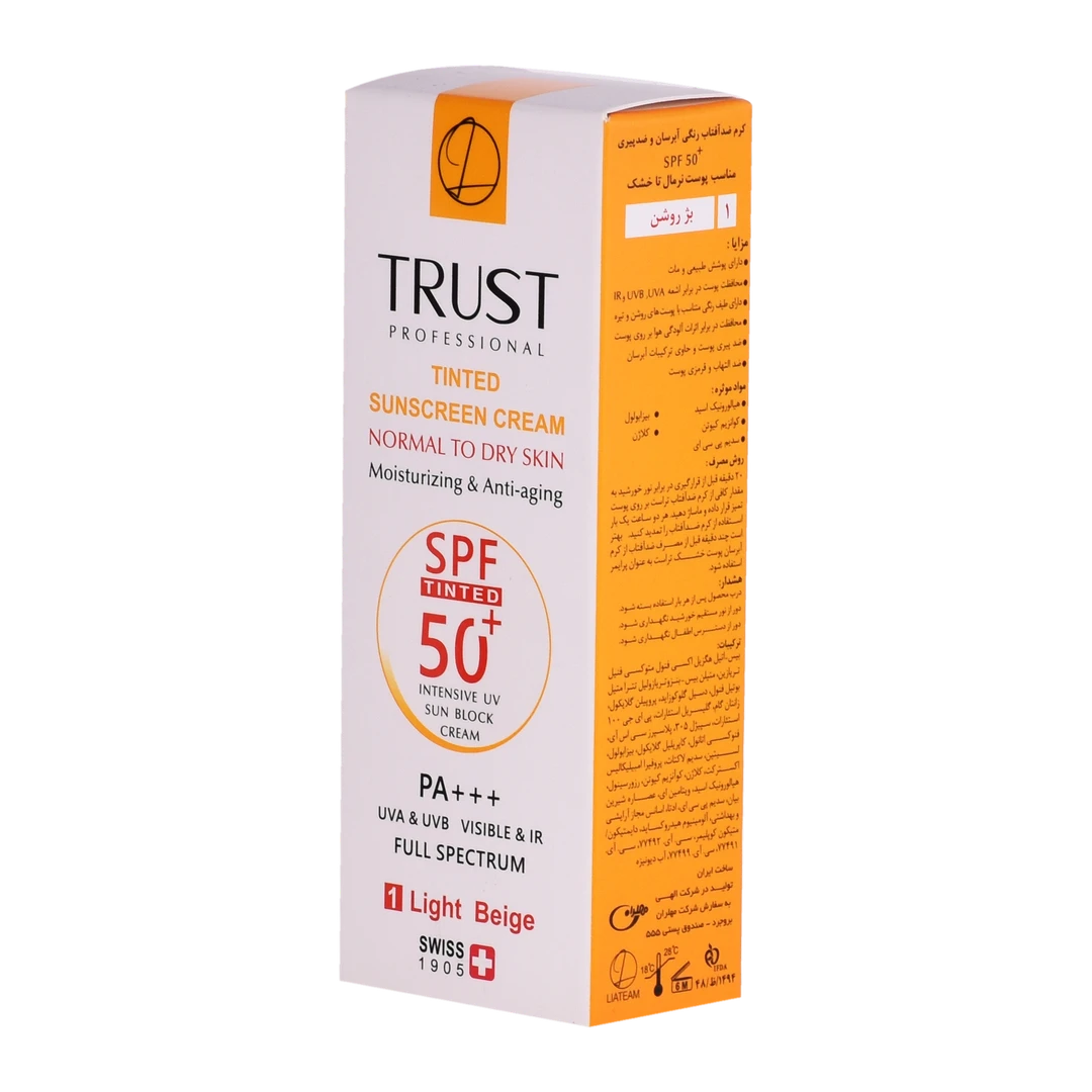 کرمهای ضدآفتاب رنگی تراست با SPF50+ از مرغوبترین و جدیدترین مواد اولیه موثره دارای حداکثر حفاظت دربرابر پرتوهای مضر خورشید ساخته شدهاند؛ این کرم با وجود بهرهمندی از بافتی سبک، دربرابر آسیبهای وارده توسط نور خورشید به خوبی از پوست محافظت و با مهار رادیکالهای آزاد از تخریب سلولهای پوستی جلوگیری میکند. همچنین با مصرف این محصول، بدون بسته شدن منافذ پوستی و ایجاد خلل در تنفس سلولهای پوستی، پوستتان آبرسانی میشود.