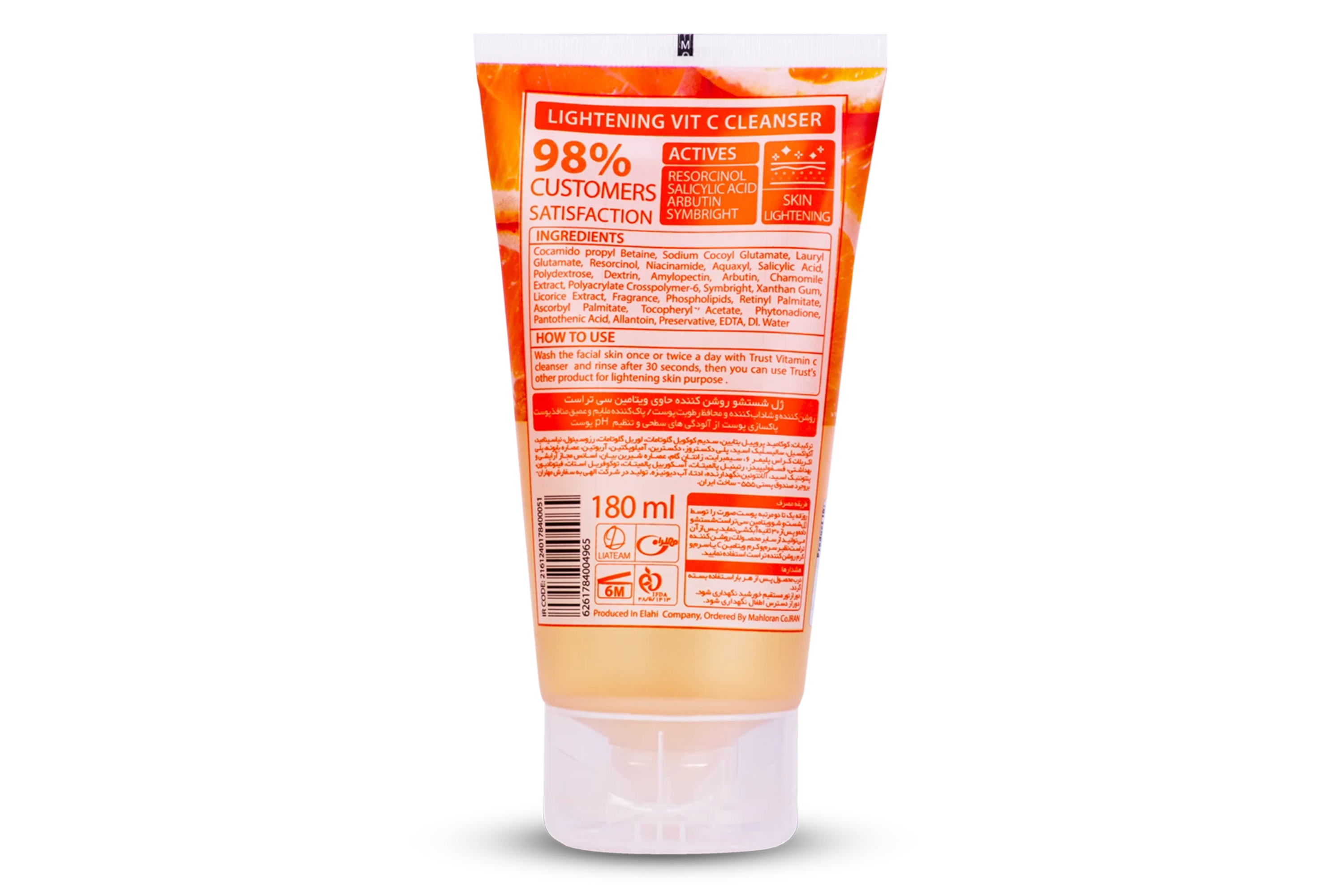 ژل شستشو روشنکننده حاوی ویتامین سی تراست به خاطر داشتن مواد مؤثره ویتامین سی، رزورسینول، سالیسیلیک اسید، آربوتین و سیم برایت، پوست را روشن و شاداب ساخته و از آن محافظت میکند. همچنین این محصول یک پاککننده ملایم و عمیق منافذ پوستی بوده و پوست را از آلودگیهای سطحی پاکسازی کرده و میزان pH پوست را تنظیم میکند.