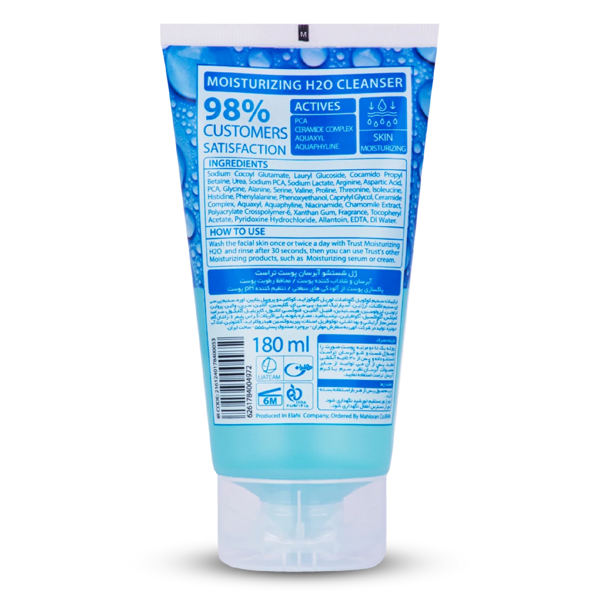 ژل شوینده آبرسان پوست تراست به خاطر داشتن ترکیبات فعال سدیم پی سی ای، زایلیتول و کمپلکس اولیگوساکاریدی موجب «حفظ رطوبت پوست» و آبرسانی مناسب سلولهای لایه اپیدرم میشود. کمپلکس سرامید این محصول، با شرکت در ساختار غشاء سلولهای پوستی به استحکام و حفظ سلولهای پوستی و «جلوگیری از ایجاد چینوچروک در پوست» کمک میکند. ترکیب آمینواسیدهای موجود در این ژل نیز به همراه ویتامین B5 باعث تغذیه سلولهای پوستی حین پاکسازی پوست میشود. این شوینده علاوه بر «پاکسازی مناسب پوست از آلودگیها»، به بهبود خشکی و تنظیم مقدار pH پوست کمک کرده و با آبرسانی سلولهای پوستی باعث حفظ استحکام پوست و جلوگیری از ایجاد لک و آکنه میشود.