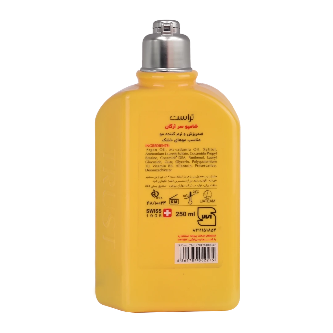 شامپو سر آرگان تراست، با داشتن روغن آرگان و روغن ماکادمیا در ترکیبات خود، تارهای خشک و شکننده موهای شما را نرم کرده و با ایجاد یک لایه چربی در سطح پوست شما، به حفظ رطوبت کمک میکند. زایلیتول موجود در این شامپو نیز به آبرسانی سریع و طولانیمدت پوست سر شما کمک کرده و موجب شادابی موهای شما میشود.