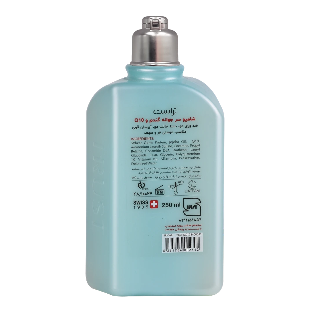 شامپو سر جوانه گندم و Q10 تراست، با داشتن پروتئین جوانه گندم، روغن جوجوبا و کوآنزیم کیوتن، از وز شدن تارهای موی شما جلوگیری کرده و حالت فر موهای شما را حفظ میکند. همچنین با استفاده از این محصول، تارهای مو و پوست سرتان آبرسانی شده و از خشکی آنها جلوگیری میشود.